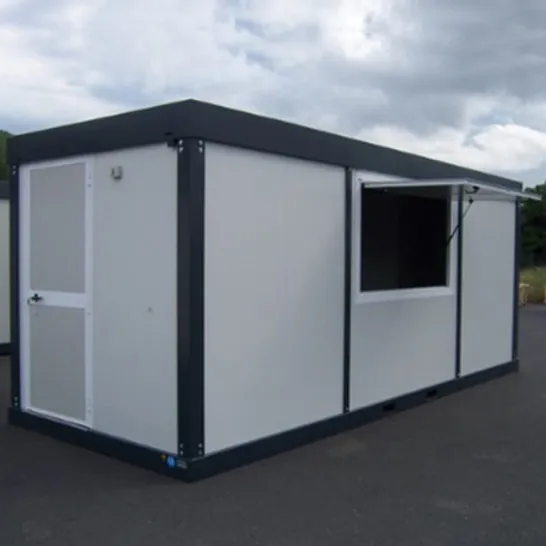 Our 6 meter snack bungalow is specially designed to accommodate snacking activities, providing a versatile module that can be installed permanently or moved frequently. This module is customizable with doors, windows and fork slots for handling with a 250 cm forklift. Additionally, it can be equipped to meet food safety standards.