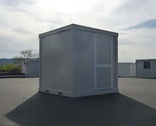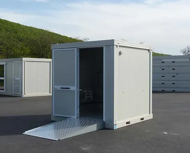 Our PMR-WC-Shower sanitary block is equipped with a switch, an LED ceiling light, a 1000 watt convector, a 50 liter electric water heater, an emergency block above the door, an electrical panel including a differential and circuit breakers (6 KW maximum) and an external connection box.
