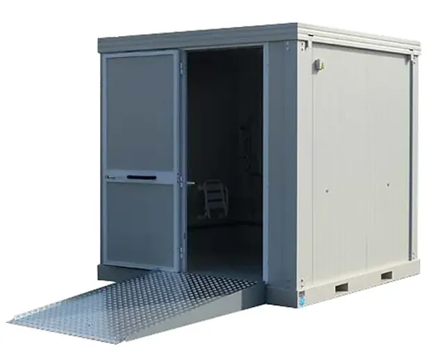The PMR WC-shower sanitary ware is equipped with a solid door measuring 104 x 220 cm (90 cm passage) with lock (without key), clinical aluminum handle and handrail.