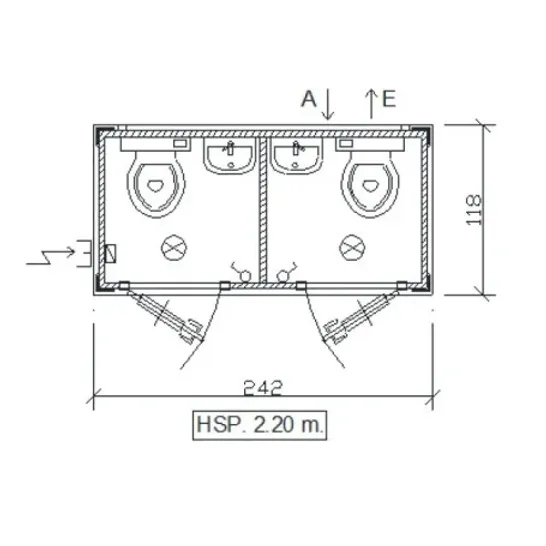 The SS1 sanitary block features dual doors, each leading to a WC cabin with washbasin, equipped with opening windows on the doors. This module is supported by four 16 cm legs at the base.